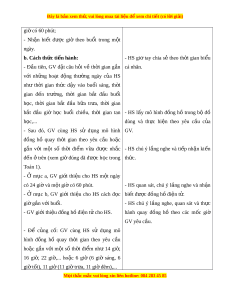 ế ở trên (xem giờ đúng đã đư c ợ h c ọ trong th c. ứ Toán 1). - Ở m c ụ a, GV gi i ớ thi u ệ cho HS m t ộ ngày có 24 gi và m ờ t ộ giờ có 60 phút. - HS quan sát, chú ý l ng ắ nghe và nh n ậ - Ở m c ụ b, GV gi i ớ thi u ệ cho HS cách đ c ọ bi t ế đư c đ ợ ồng hồ đi n t ệ . ử gi g ờ n v ắ i ớ buổi. - HS chú ý l ng ắ nghe, quan sát và th c ự - GV gi i ớ thi u đ ệ ồng hồ đi n t ệ cho H ử S. hành quay đ ng ồ hồ theo các m c ố giờ GV yêu c u. ầ - Để c ng ủ c : ố GV cùng HS sử d ng ụ mô hình đồng hồ quay th i ờ gian theo yêu c u ầ ho c ặ g n ắ v i ớ m t ộ số th i ờ đi m ể như 14 gi , ờ 16 gi , ờ 22 gi ,... ờ ho c ặ 6 giờ (6 giờ sáng, 6 gi t ờ i ố ), 11 gi ( ờ 11 giờ tr a, 1 ư 1 gi đêm ờ ),... M i