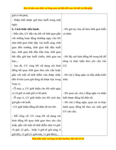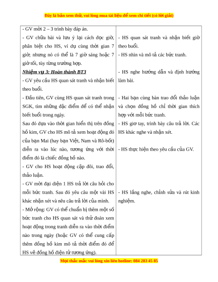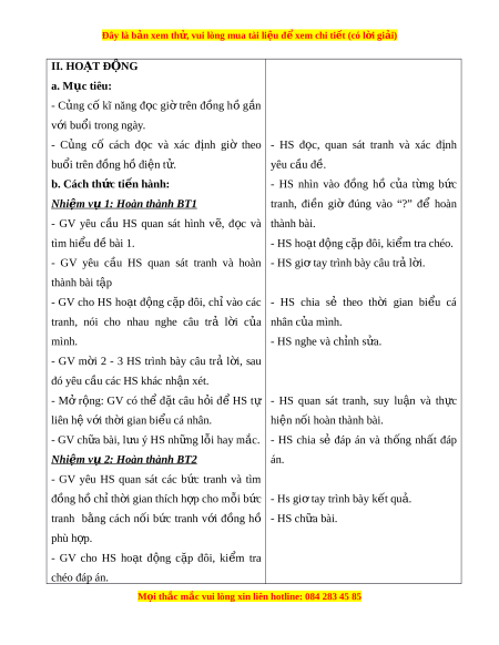 Đây là bản xem th , vu ử i lòng mua tài li u ệ đ xe ể m chi ti t (c ế ó l i ờ gi i ả ) II. HOẠT Đ N Ộ G a. Mục tiêu: - C ng ủ cố kĩ năng đ c ọ gi ờ trên đ ng ồ h ồ g n ắ v i ớ buổi trong ngày. - C ng ủ cố cách đ c ọ và xác đ nh ị giờ theo - HS đ c,