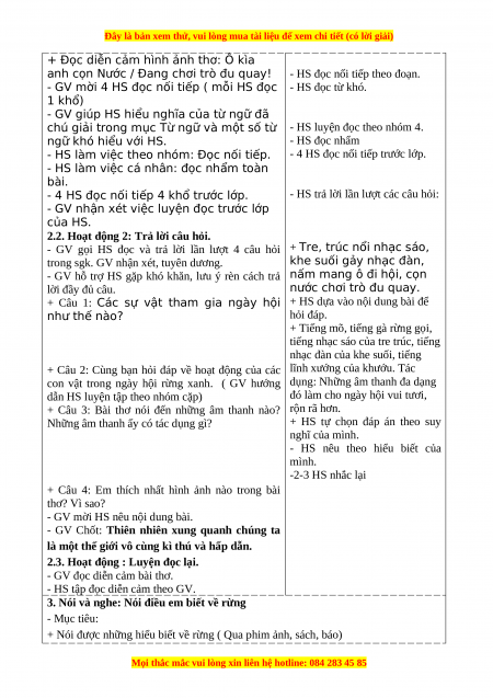 + Học sinh đọc đúng từ ngữ, câu, đoạn và toàn bộ bài thơ “Ngày hội rừng xanh”.