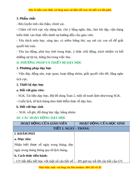 ứ thú, say mê các con số để gi i ả quy t ế bài toán. - Yêu lao đ ng, ộ phát huy tính trung th c, ự ý th c ứ chủ đ ng, ộ trách nhi m ệ và b i ồ dư ng ỡ s t ự t ự in, h ng t ứ hú trong vi c h ệ c. ọ II. PHƯ N Ơ G PHÁP VÀ THI T Ế B D Ị Y Ạ H C Ọ 1. Phư ng ơ pháp d y h ạ c ọ - Vấn đáp, đ ng ộ não, tr c ự quan, ho t ạ đ ng ộ nhóm, gi i ả quy t ế v n ấ đ , ề l ng ắ nghe tích c c. ự 2. Thi t ế b d ị y h ạ c ọ a. Đ i ố v i ớ giáo viên: - SGK, Tài li u d ệ y h ạ c, ọ B đ ộ dùng ồ Toán 2, m t ộ số tranh nh ả nh t ư rong SGK. - Cuốn l ch, t ị l ờ ch t ị háng theo th i ờ đi m ể th c t ự d ế y ạ h c. ọ b. Đ i ố v i ớ h c s ọ inh - SGK, v ghi ở , đ dùng h ồ c t ọ p, ậ b ng nhóm ả . III. CÁC HO T Ạ Đ N Ộ G D Y Ạ H C Ọ HOẠT Đ N Ộ G C A Ủ GIÁO VIÊN HOẠT Đ N Ộ G C A Ủ H C Ọ SINH