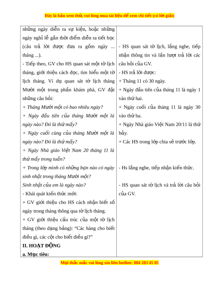 ngày trong tháng thông qua t l ờ ch ị tháng. + GV gi i ớ thi u ệ c u ấ trúc c a ủ m t ộ tờ l ch ị tháng (theo d ng ạ b ng) ả : “Các hàng cho bi t ế đi u gì ề , các c t ộ cho bi t ế đi u gì ề ?” II. HOẠT Đ N Ộ G a. Mục tiêu: M i