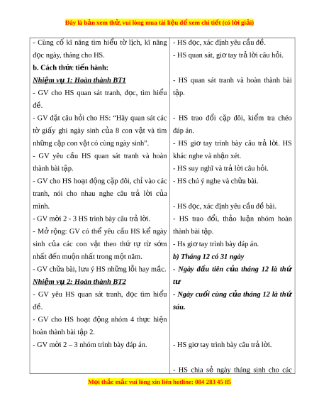 - Cùng cố kĩ năng tìm hi u ể tờ l ch, ị kĩ năng - HS đ c, ọ xác đ nh yêu c ị u đ ầ . ề đ c ngày ọ , tháng cho HS. - HS quan sát, gi t ơ ay tr l ả i ờ câu h i ỏ . b. Cách th c t ứ i n hành: ế Nhi m ệ v 1