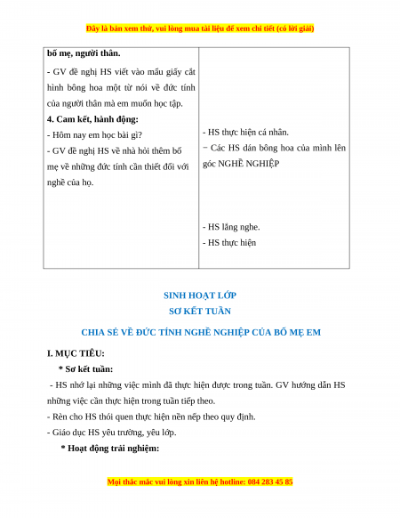 mẹ về những đức tính cần thiết đối với góc NGHỀ NGHIỆP nghề của họ. - HS lắng nghe. - HS thực hiện SINH HOẠT LỚP SƠ KẾT TUẦN