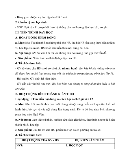 - Học sinh nắm được các yêu cầu về đọc các kiểu văn bản sẽ được học trong sách Ngữ văn 12.