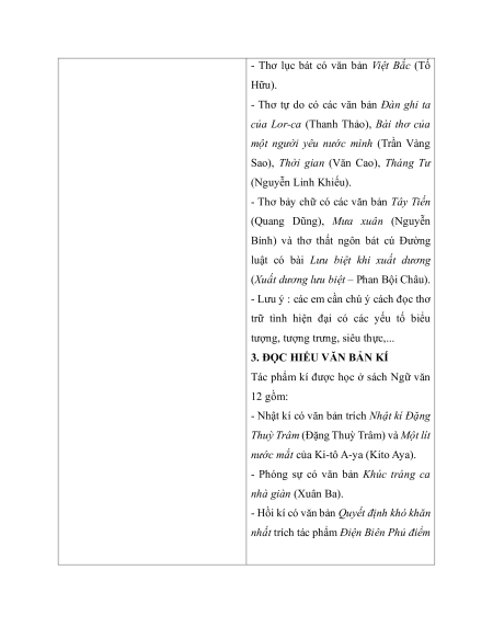 Các văn bản thơ được học tập trung vào các thể loại sau: