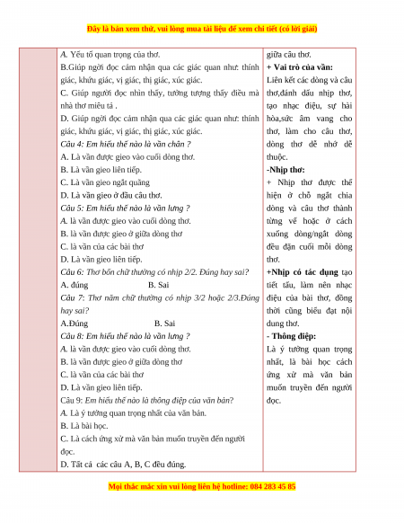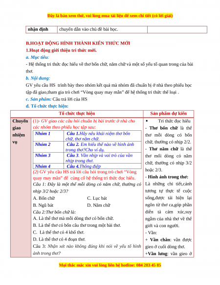 - Hệ thống tri thức đọc hiểu về thơ bốn chữ, năm chữ và một số yếu tố quan trong của bài thơ. b. Nội dung: