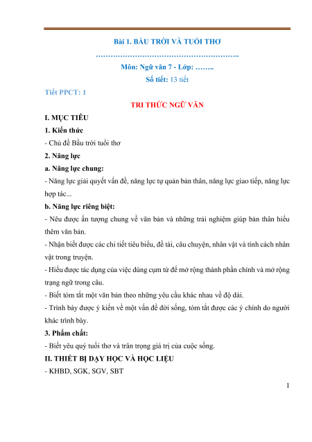 Môn: Ngữ văn 7 - Lớp: …….. Số tiết: 13 tiết Tiết PPCT: 1 TRI THỨC NGỮ VĂN I. MỤC TIÊU 1. Kiến thức