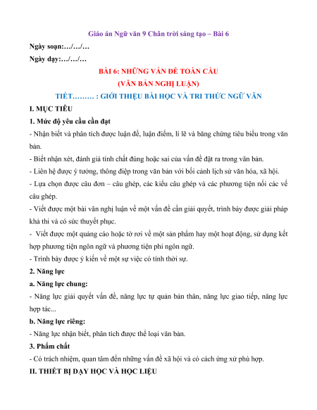 Giáo án Ngữ văn 9 Chân trời sáng tạo – Bài 6 Ngày soạn:…/…/… Ngày dạy:…/…/…