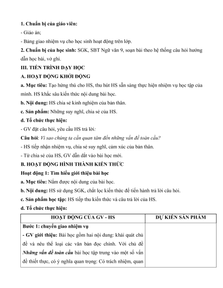 2. Chuẩn bị của học sinh: SGK, SBT Ngữ văn 9, soạn bài theo hệ thống câu hỏi hướng dẫn học bài, vở ghi.