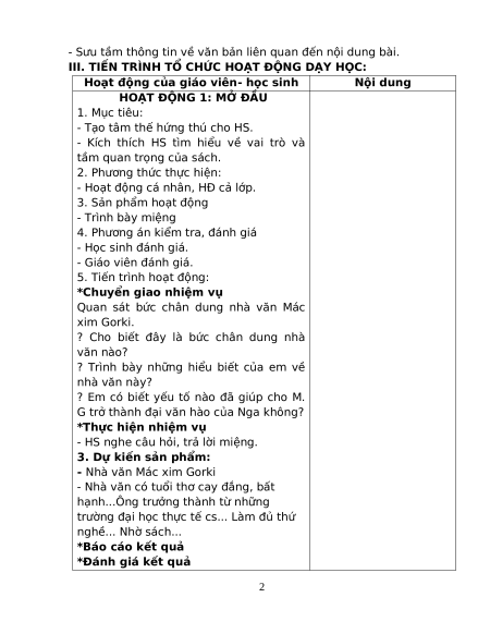 3. Dự kiến sản phẩm: - Nhà văn Mác xim Gorki