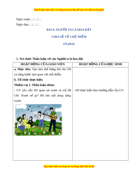 Ngày so n ạ :…/…/… Ngày d y ạ :…/…/… BÀI 8: NGƯ I Ờ TA LÀ HOA Đ T Ấ CHIA S Ẻ VỀ CHỦ ĐI M Ể (10 phút) 1. Trò ch i ơ : Th o ả lu n ậ v ề câu Ngư i ờ ta là hoa đ t ấ HO T Ạ ĐỘNG C A Ủ GIÁO VIÊN HOẠT ĐỘNG C A Ủ H C Ọ SINH a. M c ụ tiêu: T o ạ tâm thế h n ứ g thú cho HS và t n ừ g b c ướ làm quen v i ớ ch ủ đi m. ể b. T ổ ch c ứ th c ự hi n ệ Nhiệm v ụ 1: Th o ả lu n ậ nhóm - GV yêu c u