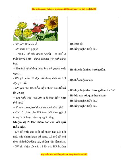 ầ cô và 3 HS – đang đàn hát trên m t ộ cánh hoa. + Tranh 2 vẽ nh n ữ g bông hoa có g n ươ g m t ặ - HS th c ự hi n ệ theo h n ướ g d n ẫ . ng i ườ . - GV yêu c u ầ HS đ c ọ n i ộ dung chia s . ẻ HS - HS th o ả lu n ậ nhóm. đ c ọ yêu c u ầ . - GV yêu c u ầ HS th o ả lu n ậ nhóm đôi đ ể trả - HS th c ự hi n ệ theo h n ướ g d n ẫ c a ủ GV. l i ờ 2 CH: - HS báo cáo k t ế qu ả theo nhóm. + Em hi u ể câu “Ng i ườ ta là hoa đ t