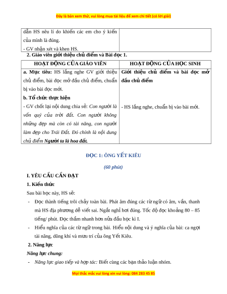 - Năng l c ự t ự ch ủ và t ự h c: ọ trả l i ờ đúng các câu h i ỏ đ c ọ hi u ể . Năng l c ự văn h c ọ - Bi t ế bày t ỏ s ự yêu thích v i ớ m t ộ siis t ừ ng ữ hay, hình n ả h đ p ẹ . - Bi t ế nêu nh n ậ xét v ề nhân v t ậ Y t ế Kiêu. 3. Ph m ẩ ch t ấ - B i ồ d n ưỡ g ph m ẩ ch t ấ yêu n c ướ (yêu đ t ấ n c, ướ tự hào về l ch ị sử b o ả vệ Tổ quốc c a ủ nhân dân ta, khâm ph c ụ nh n ữ g ng i ườ anh hùng c u ứ n c, ướ ...) II. Đ Ồ DÙNG D Y Ạ H C Ọ a. Đ i ố v i ớ giáo viên - SGK Ti n ế g Vi t ệ 4 (t p ậ 1), SGV Ti n ế g Vi t ệ 4 (t p ậ 1), Vở bài t p ậ Ti n ế g Vi t ệ (t p ậ 1).