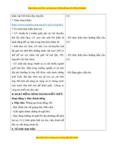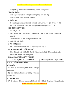 - Máy tính, máy chi u ế . b. Đ i ố v i ớ h c ọ sinh - SGK Ti n ế g Vi t ệ 4 (t p ậ 1), V ở bài t p ậ Ti n ế g Vi t ệ (t p ậ 1). III. HÌNH TH C Ứ T Ổ CH C Ứ D Y Ạ H C Ọ - Hình th c ứ d y ạ h c ọ chính: HĐ đ c ộ l p ậ (làm vi c ệ đ c ộ l p ậ ), HĐ nhóm (th o ả lu n ậ nhóm), HĐ l p ớ (trò ch i ơ ph n ỏ g v n ấ ). IV. CÁC HO T Ạ Đ N Ộ G D Y Ạ VÀ H C Ọ HOẠT ĐỘNG C A Ủ GIÁO VIÊN HO T Ạ ĐỘNG C A Ủ H C Ọ SINH A. HO T Ạ Đ N Ộ G KH I Ở Đ N Ộ G a. M c ụ tiêu - GV nh c ắ l i ạ m t ộ số quy c ướ cho HS về h c ọ Ti n ế g Vi t ệ . - T o ạ tâm thế h n ứ g thú cho HS và t n ừ g b c ướ làm quen bài h c. ọ b. Cách ti n ế hành - GV tổ ch c ứ cho HS xem video ho t ạ hình nói về - HS ho t ạ đ n ộ g theo h n ướ g d n ẫ c a ủ