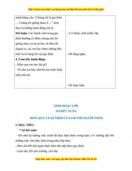 MÓN QUÀ VÀ KỈ NIỆM CỦA EM VỚI NGƯỜI THÂN I. MỤC TIÊU: * Sơ kết tuần: