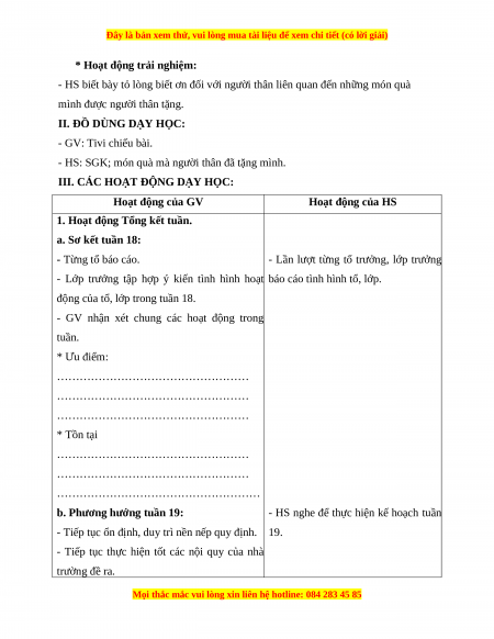 1. Hoạt động Tổng kết tuần. a. Sơ kết tuần 18: