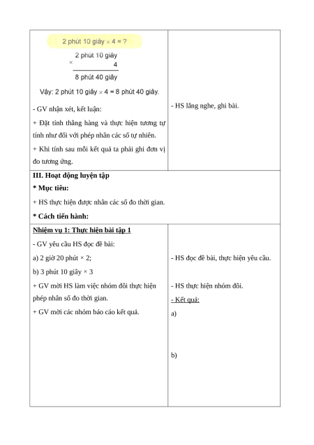 + HS thực hiện được nhân các số đo thời gian. * Cách tiến hành: