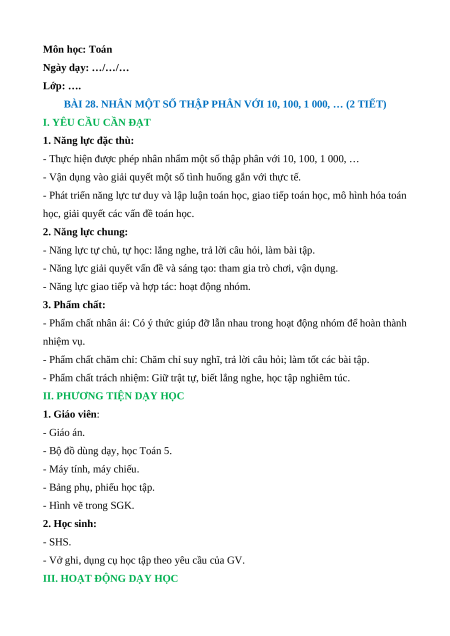 Giáo án Nhân một số thập phân với 10, 100, 1000, … Toán lớp 5 Cánh diều