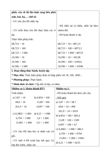- GV triển khai cho HS thực hiện các ví nhóm đôi. dụ: - HS hoàn thành ví dụ: Thực hiện phép tính: 68,723 × 10 68,723 × 10 = 687,23 68,723 × 100 68,723 × 100 = 6872,3 68,723 × 1 000 68,723 × 1 000 = 68723 10,596 × 10 10,596 × 10 = 105,96 10,596 × 100 10,596 × 100 = 1059,6 10,596 × 1 000 10,596 × 1 000 = 10596