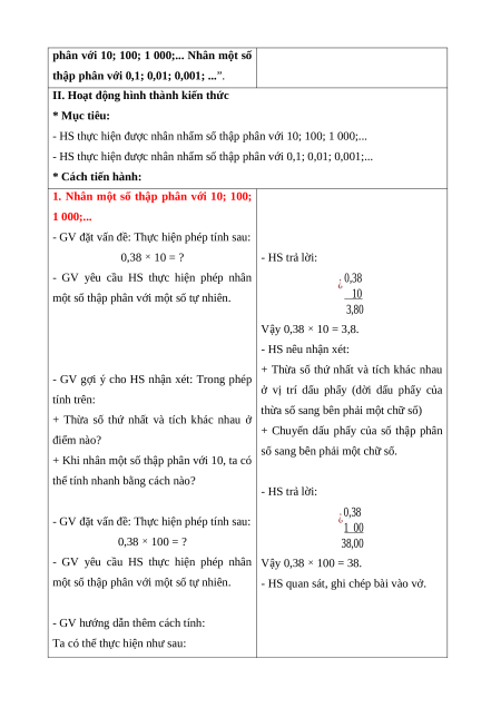- GV đặt vấn đề: Thực hiện phép tính sau: 0,38 × 10 = ? - HS trả lời: