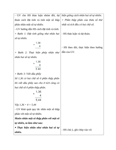 hai chữ số ở phần thập phân. Vậy 1,36 × 4 = 5,44