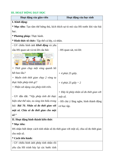 BÀI 70. NHÂN SỐ ĐO THỜI GIAN VỚI MỘT SỐ. CHIA SỐ ĐO THỜI GIAN CHO MỘT SỐ