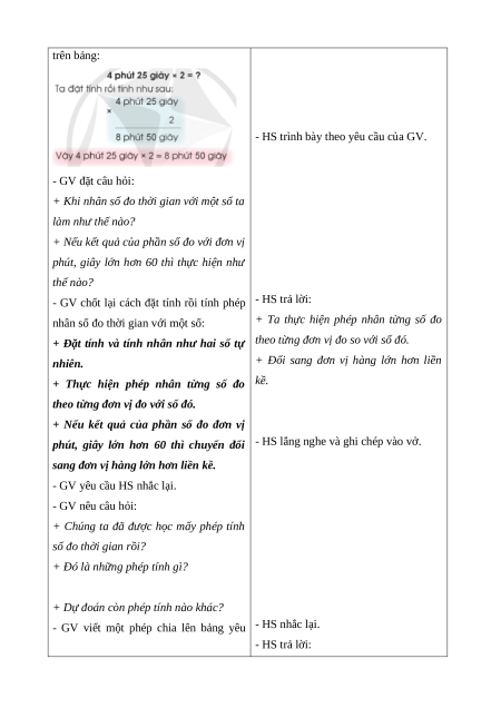 HS nhận biết được cách tính nhân số đo thời gian với một số, chia số đo thời gian cho một số. * Cách tiến hành: