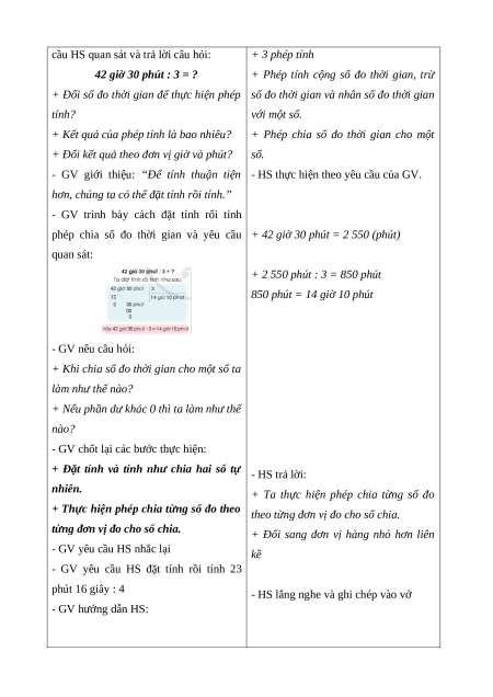 phép chia số đo thời gian và yêu cầu + 42 giờ 30 phút = 2 550 (phút) quan sát: