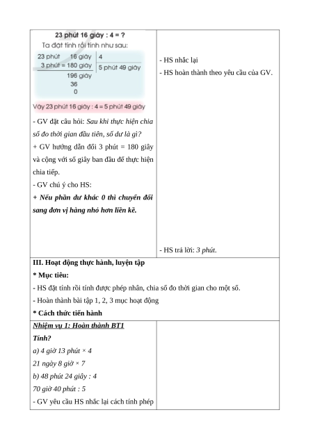 - GV yêu cầu HS đặt tính rồi tính 23 phút 16 giây : 4