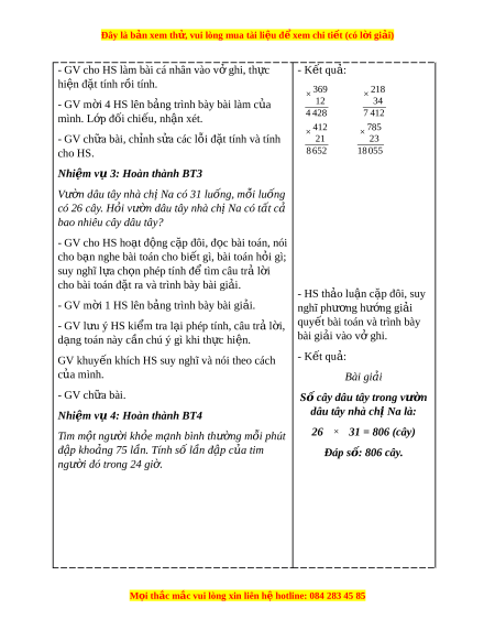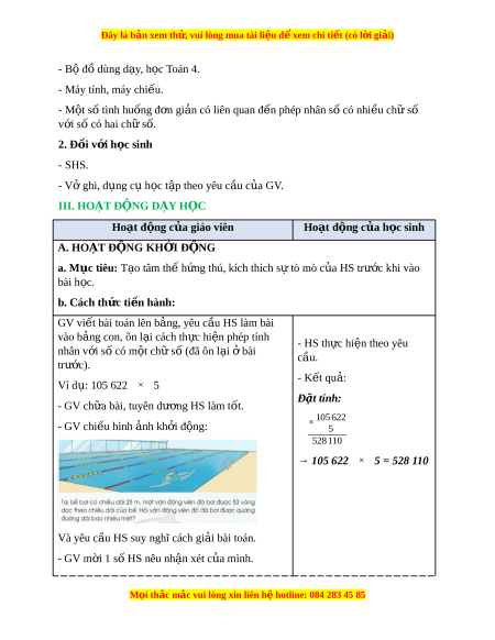 Đây là bản xem th , vu ử i lòng mua tài li u ệ đ xe ể m chi ti t (c ế ó l i ờ gi i ả ) - Bộ đồ dùng d y ạ , h c ọ Toán 4. - Máy tính, máy chi u. ế - M t ộ số tình huống đ n gi ơ n ả có liên quan đ n phép ế nhân s có nhi ố u ch ề s ữ ố v i ớ số có hai ch s ữ ố. 2. Đ i ố v i ớ h c s ọ inh - SHS. - Vở ghi, d ng c ụ h ụ c ọ t p t ậ heo yêu c u c ầ a ủ GV. III. HOẠT Đ N Ộ G D Y Ạ H C Ọ Hoạt đ ng c ộ a gi ủ áo viên Hoạt đ ng c ộ a h ủ c s ọ inh A. HOẠT Đ N Ộ G KH I Ở Đ N Ộ G a. Mục tiêu: T o t ạ âm th h ế ng t ứ