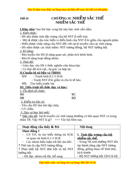 - Rèn luyện cho HS kĩ năng quan sát, phân tích kênh hình. - Rèn kĩ năng ho t ạ đ ng nhóm ộ . 3. Thái độ : - Giáo d c ụ cho HS ý th c nghi ứ ên c u ứ khoa h c ọ - Có thái đ t ộ ích c c ự , t gi ự ác và h p ợ tác. I I.Chu n b ẩ t ị ài li u và ệ TBDH : GV: - Tranh hình 8.1-5 SGK - Tranh NST kì ở gi a và chu kì ữ t bào. ế HS: Tìm hi u t ể rư c ớ bài I II. Ti n t ế rình t ch ổ c d ứ y và h ạ c ọ : 1.