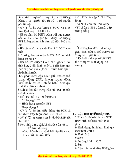 Đây là bản xem th , vu ử i lòng mua tài li u ệ đ xe ể m chi ti t (c ế ó l i ờ gi i ả ) GV nhấn m nh ạ : Trong c p ặ NST tư ng ơ NST ch a ứ các c p ặ NST tư ng ơ đồng: 1 có ngu n ồ g c ố từ bố, 1 có ngu n ồ đồng gốc t m ừ ẹ - B N ộ ST đ n ơ b i ộ (n) là bộ - GV Y /C hs đ c ọ b ng ả 8 SGK và th c ự NST ch a ứ 1 NST c a m ủ i ỗ c p ặ hiện lệnh m c I ụ SGK (T24) tư ng ơ đồng - HS so sánh bộ NST lư ng ỡ b i ộ c a ủ ngư i ờ v i ớ các loài còn l i