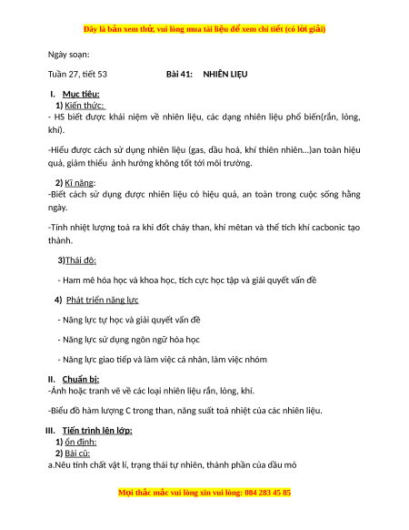 Tuần 27, tiết 53 Bài 41: NHIÊN LIỆU I. M ục tiêu: 1) K iến thức: