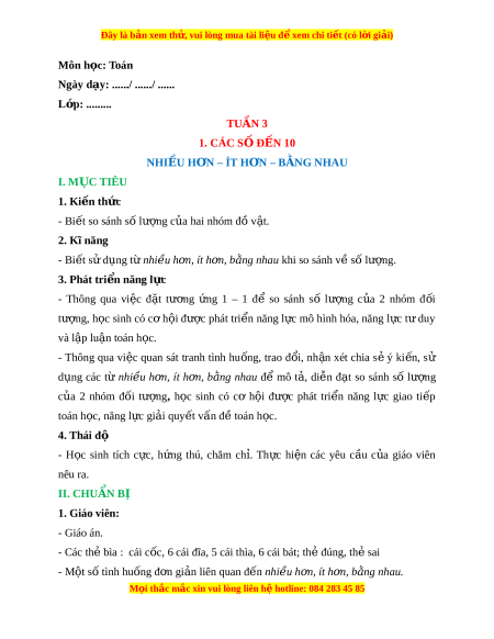 Ngày dạy: ....../ ....../ ...... L p: ớ ......... TUẦN 3 1. CÁC S Đ Ố ẾN 10 NHIỀU H N Ơ – ÍT H N Ơ – BẰNG NHAU I. M C Ụ TIÊU 1. Ki n t ế h c ứ - Bi t ế so sánh số lư ng c ợ a hai ủ nhóm đ v ồ t ậ . 2. Kĩ năng - Bi t ế sử d ng t ụ ừ nhi u h ề n, ơ ít h n, ơ b ng nhau ằ