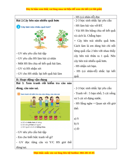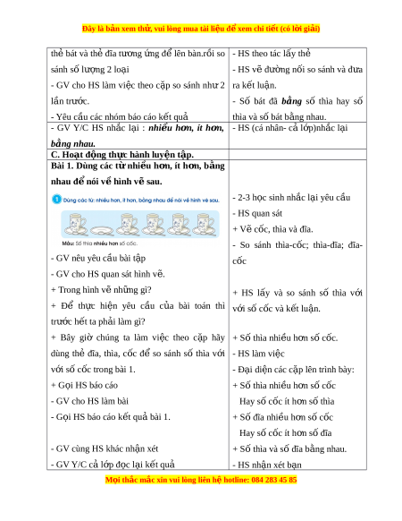 Đây là bản xem th , vu ử i lòng mua tài li u ệ đ xe ể m chi ti t (c ế ó l i ờ gi i ả ) - HS th c ự hi n ệ l y ấ 6 thẻ bát và 7 thẻ cốc đ l ể ên bàn. - HS trao đ i ổ theo c p ặ : Số c c ố nhi u h ề n s ơ ố bát. - GV g n ắ lên b ng ả và yêu c u ầ h c ọ sinh l y ấ thẻ bát và th c ẻ ốc tư ng ơ ng ứ đ l ể ên bàn. - Yêu c u ầ h c ọ sinh trao đ i ổ c p ặ đôi nói cho + HS v t ẽ heo nhau nghe số bát nhi u ề h n ơ số c c ố hay số cốc nhi u h ề n ơ số bát? - Th a ừ ra 1 cái - GV hư ng ớ d n ẫ HS cách xác đ nh ị số c c ố - HS nh c ắ l i ạ nhi u h ề n ơ số bát. + V đ ẽ ư ng n ờ ối tư ng ơ ng t ứ h bát ẻ và c c. ố + Ta th y s ấ ố cốc th a ừ ra m y cái ấ ? + Ch ng ứ tỏ số c c ố đã nhi u ề h n