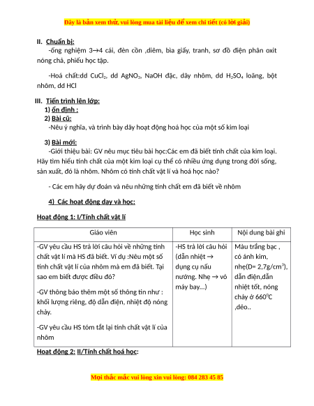 -Hoá chất:dd CuCl2, dd AgNO3, NaOH đặc, dây nhôm, dd H2SO4 loãng, bột nhôm, dd HCl III. T