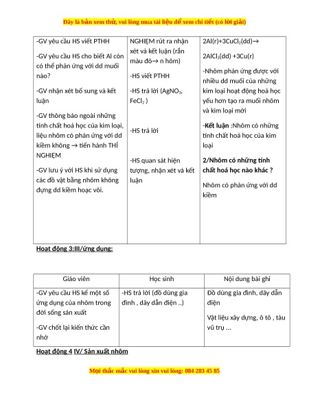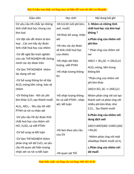 Đây là bản xem th , vu ử i lòng mua tài li u ệ đ xe ể m chi ti t (c ế ó l i ờ gi i ả ) -GV yêu cầu HS viết PTHH NGHIỆM rút ra nhận 2Al(r)+3CuCl2(dd)→ xét và kết luận (rắn
