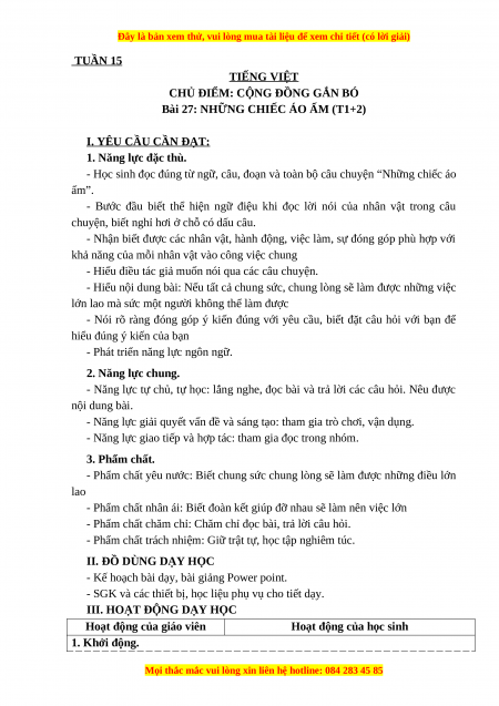 Bài 27: NHỮNG CHIẾC ÁO ẤM (T1+2) I. YÊU CẦU CẦN ĐẠT: 1. Năng lực đặc thù.