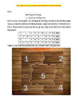 Câu 4: Truyện Kiều là truyện thơ của tác giả nào. Ông có tên chữ là Tố Như, hiệu là Thanh Hiên. 1 L U C B A T C1 Đ/S 2 T H U Y K I E U C2 Đ/S 3 C H U N O M C3 Đ/S 4 N G U Y E N D U C4 Đ/S