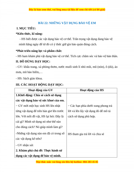 BÀI 22: NHỮNG VẬT DỤNG BẢO VỆ EM I. MỤC TIÊU: