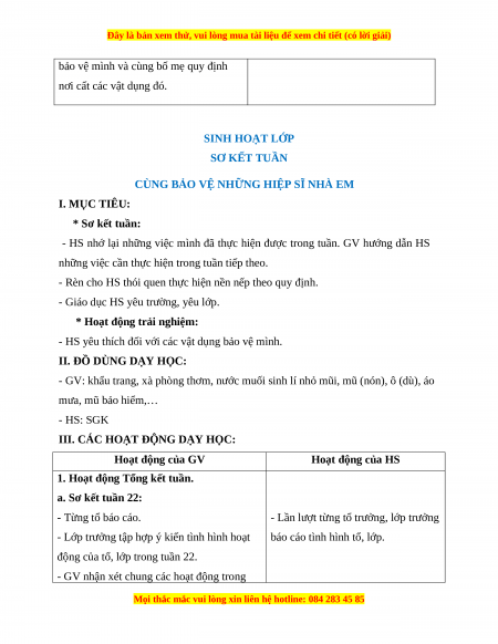 CÙNG BẢO VỆ NHỮNG HIỆP SĨ NHÀ EM I. MỤC TIÊU: * Sơ kết tuần: