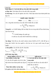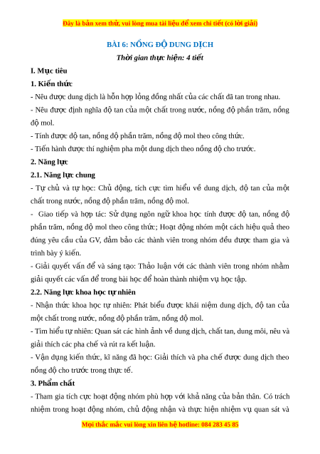 Đây là bản xem th , vu ử i lòng mua tài li u ệ đ xe ể m chi ti t ế (có l i ờ gi i ả ) BÀI 6: N N Ồ G Đ D Ộ UNG D C Ị H Th i ờ gian th c hi ự n: ệ 4 ti t ế I. M c t ụ iêu 1. Ki n t ế h c ứ - Nêu đư c ợ dung d ch ị là h n h ỗ p ợ l ng đ ỏ ng nh ồ t ấ c a ủ các ch t ấ đã tan trong nhau. - Nêu đư c ợ đ nh ị nghĩa độ tan c a ủ m t ộ ch t ấ trong nư c, ớ n ng ồ đ ộ ph n ầ trăm, n ng ồ độ mol. - Tính đư c đ ợ ộ tan, n ng đ ồ ộ ph n t ầ răm, n ng đ ồ m ộ ol theo công th c. ứ - Ti n hành đ ế ư c ợ thí nghi m ệ pha m t ộ dung d ch t ị heo n ng đ ồ cho ộ trư c. ớ 2. Năng l c ự 2.1. Năng l c chung ự - Tự chủ và tự h c: ọ Chủ đ ng, ộ tích c c ự tìm hi u ể về dung d ch, ị độ tan c a ủ m t ộ chất trong nư c, n ớ ồng đ ph ộ n t ầ răm, n ng đ ồ m ộ ol. - Giao ti p ế và h p ợ tác: Sử d ng ụ ngôn ngữ khoa h c ọ tính đư c ợ độ tan, n ng ồ độ phần trăm, n ng ồ độ mol theo công th c ứ ; Ho t ạ đ ng ộ nhóm m t ộ cách hi u ệ quả theo đúng yêu c u ầ c a ủ GV, đ m ả b o