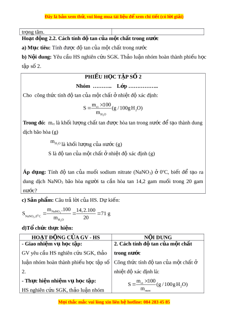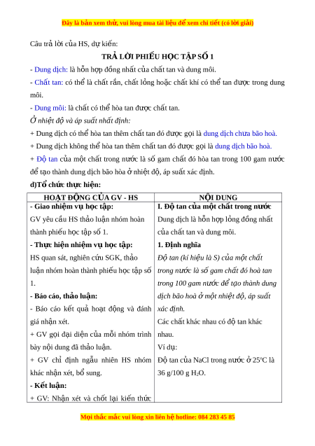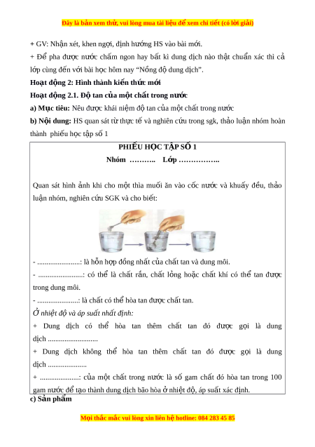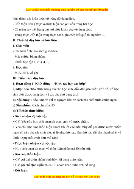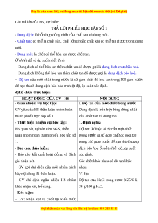 Đây là bản xem th , vu ử i lòng mua tài li u ệ đ xe ể m chi ti t ế (có l i ờ gi i ả ) hình thành các ki n t ế h c v ứ n ề ng đ ồ dung d ộ ch. ị - Cẩn th n, t ậ rung th c và t ự h c ự hi n các ệ yêu c u t ầ rong bài h c. ọ - Có ni m ề say mê, h ng t ứ hú v i ớ vi c khám ệ phá về dung d ch. ị - Trung th c, ự c n t ẩ h n t ậ rong th c hành, ghi ự chép k t ế qu t ả hí nghi m ệ … II. Thi t ế b d ị ạy h c ọ và h c l ọ i u ệ 1. Giáo viên - Các hình nh t ả heo sách giáo khoa; - Máy chi u, b ế ng nhóm ả ; - Phi u h ế c t ọ p ậ 1, 2, 3, 4, 5, 6 2. H c ọ sinh - SGK, SBT, vở ghi. III. Ti n t ế rình d y h ạ c ọ 1. Hoạt đ ng 1 ộ : Kh i ở đ ng – “K ộ
