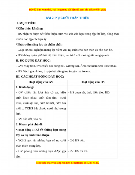 BÀI 2: NỤ CƯỜI THÂN THIỆN I. MỤC TIÊU: