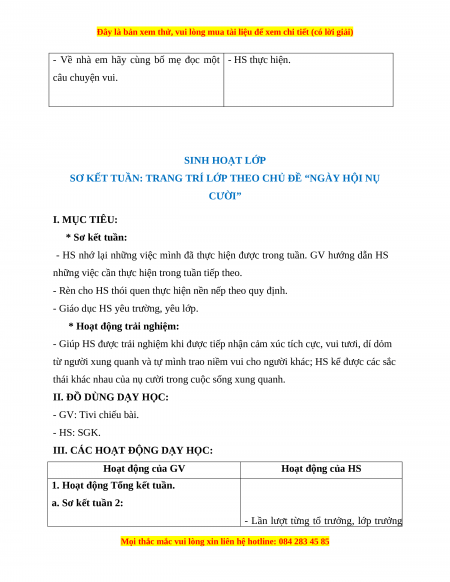 1. Hoạt động Tổng kết tuần. a. Sơ kết tuần 2: