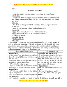 - Rèn cho hs kĩ năng quan sát hình, ho t ạ đ ng ộ nhóm, khái quát ki n t ế h c. ứ 3. Thái đ : ộ - Giáo d c cho ụ hs ý th c gi ứ gì ữ n và b o ả v m ệ ôi trư ng. ờ II chuẩn bị: 1. GV: -Tranh hình sgk, t l ư i u v ệ ô nhi ề m ễ môi trư ng. ờ 2: HS: - Nghiên c u t ứ hông tin v ô nhi ề m ễ môi trư ng. ờ III. Ti n t ế rình lên l p: ớ 1. ổn định tổ ch c ứ : 2. Ki m ể tra bài cũ: 3. Bài m i ớ : * Đ t ặ v n ấ đề:? Em hãy nêu nh ng ữ vi c ệ làm nh ả hư ng ở x u ấ t i ớ môi trư ng ờ tự nhiên và bi n ệ pháp kh c ắ ph c.( ụ Săn b t ắ ĐV hoang dã, đ t ố r ng ừ l y ấ đ t ấ tr ng ồ tr t