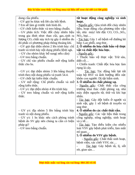 Đây là bản xem th , vu ử i lòng mua tài li u ệ đ xe ể m chi ti t (c ế ó l i ờ gi i ả ) dung c a ủ phi u. ế từ hoạt đ ng ộ công nghi p ệ và sinh - GV g i ọ hs khác trả l i ờ câu h i ỏ l nh. ệ hoạt. ? Em s l ẽ àm gì trư c t ớ ình hình đó. - Nguồn g c: ố Qúa trình đ t ố cháy nhiên - GV chốt ki n t ế h c ứ và treo b ng ả chu n. ẩ liệu, ho t ạ đ ng ộ c a ủ phư ng ơ ti n ệ v n ậ - GV phân tích: Vi c ệ đ t ố cháy nhiên li u ệ t i ả , nhà máy khí đ c ộ CO, CO2 ,SO2, trong gia đình nh : ư than c i ủ , gas..sinh ra NO2, b i ụ … lư ng