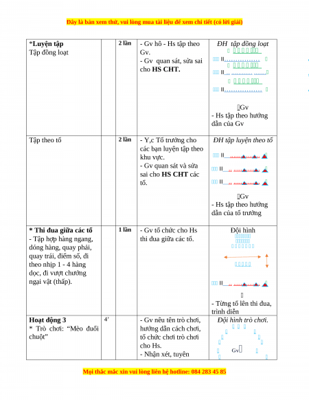 * Thi đua giữa các tổ 1 lần - Gv tổ chức cho Hs Đội hình - Tập hợp hàng ngang, thi đua giữa các tổ. dóng hàng, quay phải, quay trái, điểm số, đi theo nhịp 1 - 4 hàng dọc, đi vượt chướng ngại vật (thấp). II .. ............... - Từng tổ lên thi đua, trình diễn Hoạt động 3 4’ - Gv nêu tên trò chơi,