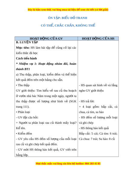 Giáo án Ôn tập Biểu đồ tranh, Có thể, Chắc chắn, Không thể Toán 2 Chân trời sáng tạo