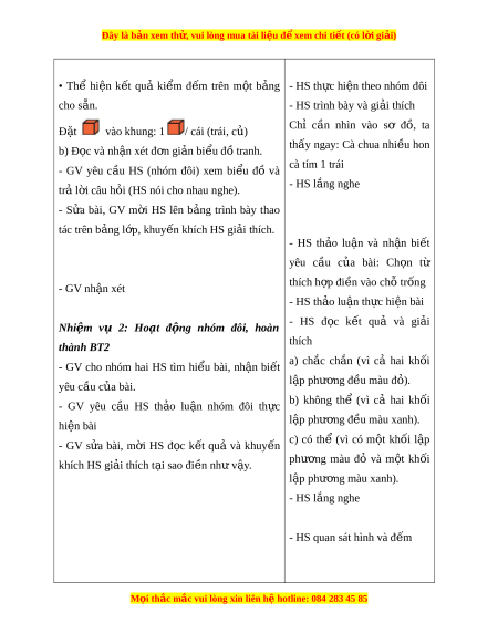 b) không thể (vì cả hai kh i ố - GV yêu c u ầ HS th o ả lu n ậ nhóm đôi th c ự l p ph ậ ư ng ơ đ u m ề àu xanh). hiện bài c) có thể (vì có m t ộ kh i ố l p ậ - GV s a ử bài, m i ờ HS đ c ọ k t ế quả và khuy n ế phư ng ơ màu đỏ và m t ộ kh i ố khích HS gi i ả thích t i ạ sao đi n nh ề v ư y ậ . l p ph ậ ư ng ơ màu xanh). - HS l ng ắ nghe - HS quan sát hình và đ m ế M i